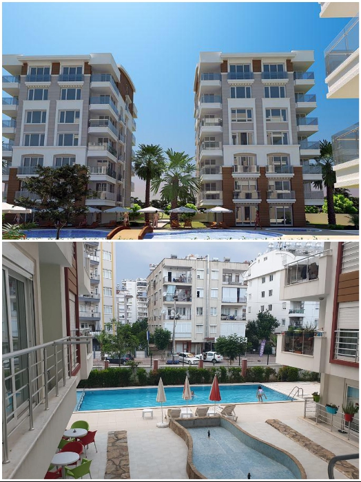 В новостройках Анталии квартиру в жилом комплексе можно купить от 70 тыс. дол. с общей площадью (брутто) более 85 кв.м. | Фото: luxestate-turkey.com/ booking.com.Если площадь наших квартир рассчитывается по внутреннему периметру, включая балкон и лоджии, турецкие же измерения производятся по внешнему (брутто). При этом включается все вышеперечисленное, а также толщина стен и даже общая лестничная площадка, при этом ее площадь делится на все имеющиеся квартиры.Важно: Такие нормы не способны обмануть несведущих в столь необычных расчетах. Причина кроется в законодательстве, ведь под застройку продается земля, а это значит, что каждый должен пропорционально платить за использование и общих частей.