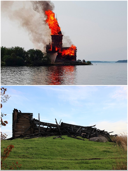 Все что осталось от древней святыни – Свято-Успенской церкви (Кондопог, Карелия). | Фото: m24.ru/ pikabu.ru.Свою святыню местные жители бережно сохраняли и даже в годы советской власти она уцелела, хотя и многие десятилетия не была местом богослужений. Но в 2018 г. церковь, созданную на закате деревянного зодчества России, умышленно подожгли. Несмотря на усилия пожарной команды Успенская церковь выгорела практически дотла.