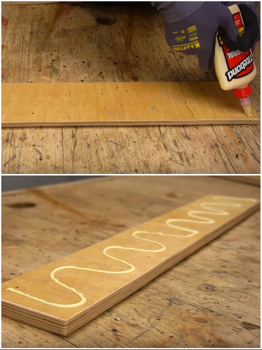 Дополнительную планку для укрепления основы под удержание конструкции полки-стеллажа сначала нужно приклеить. | Фото: youtube.com/ © Men's Craft.Ту сторону конструкции, где будет устанавливаться основная часть с полками, стоит укрепить с помощью дополнительной деревянной планки. Это обязательное условие, ведь именно этот своеобразный козырек будет удерживать всю массу подвесной полки-стеллажа и всего содержимого. Для этого понадобится столярный клей или ПВА и несколько коротких саморезов по дереву. Вот именно к ней и прикручивается вторая пластина дверных петель с подготовленным к дальнейшим процессам стендом.