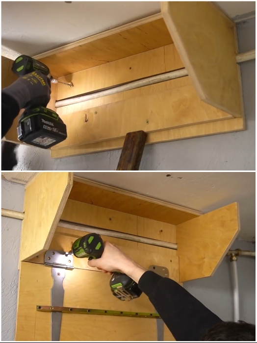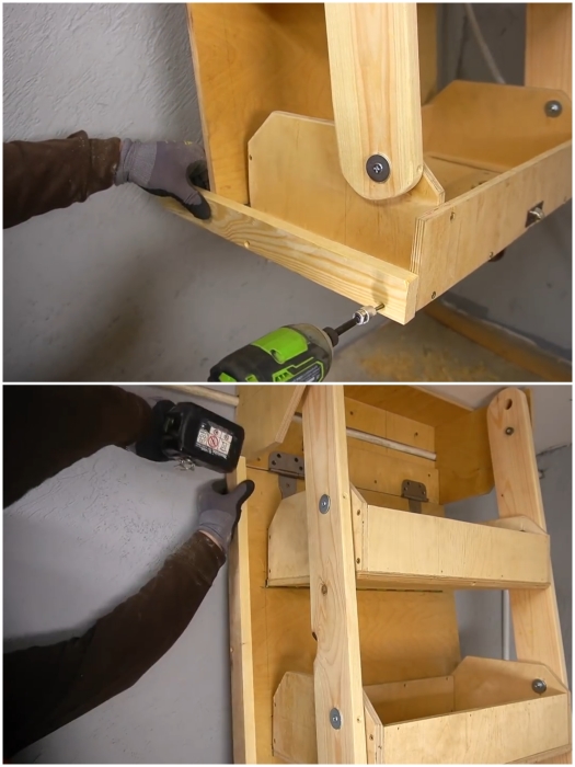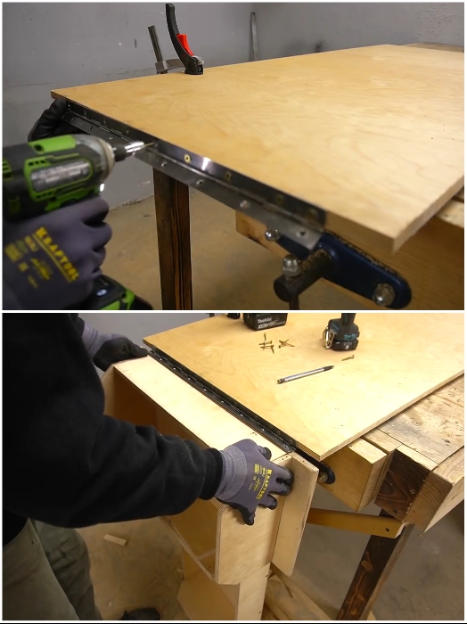 С помощью рояльных петель ящик закрепляем внизу конструкции. | Фото: youtube.com/ © Men's Craft.