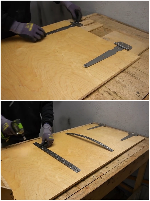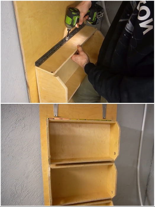 На верхнюю часть стеллажа-полки прикручиваем одну часть дверных петель, а по полотну стенда рояльные петли для закрепления ящиков. | Фото: youtube.com/ © Men's Craft.После установки нижнего ящика с другой стороны основного полотна закрепляется большая часть накладной пластины дверных петель. После расчета места размещения остальных ящиков нужно закрепить рояльные петли только с одной стороны. Это облегчит их установку в дальнейшем.