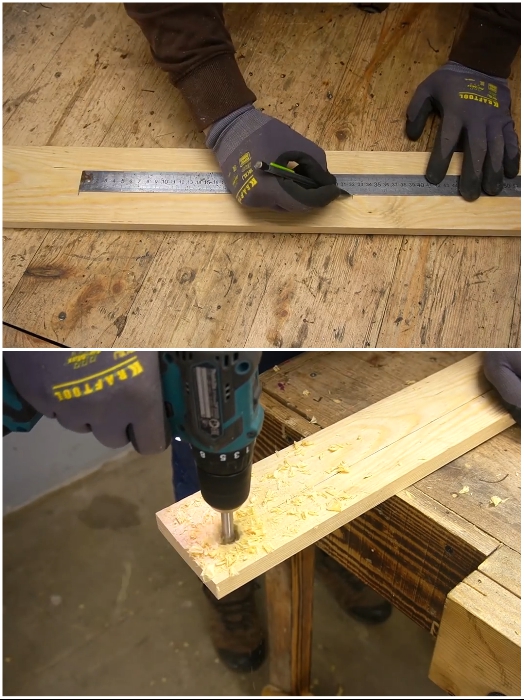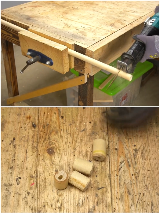 Процесс изготовления деревянной втулки. | Фото: youtube.com/ © Men's Craft.Для этого понадобится две рейки одинаковой длины и ширины, на которых нужно сделать разметку и отверстия большого диаметра, чтобы можно было установить в них деревянную втулку с фиксирующей шайбой и мебельным шурупом.