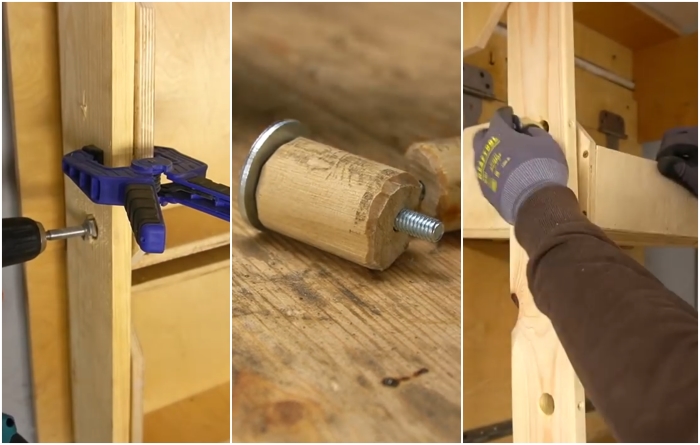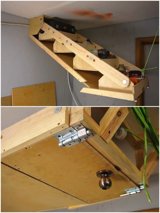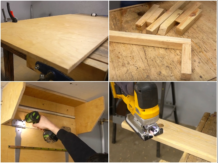 Древесно-стружечные материалы, электроинструменты, крепежные изделия и фурнитура. | Фото: youtube.com/ © Men's Craft.Для такой самоделки понадобятся:- листы мебельного щита (толстая фанера, плиты ОСБ и т.д.);- деревянные рейки, брус;- рояльные петли, дверные петли, шпингалеты, дверная ручка с защелкой, веревка, блок с роликом;- электроинструменты (шуруповерт, дрель, лобзик, сабельная пила);- крепежные изделия различных типов и размеров, шлифовальная бумага, столярный клей.