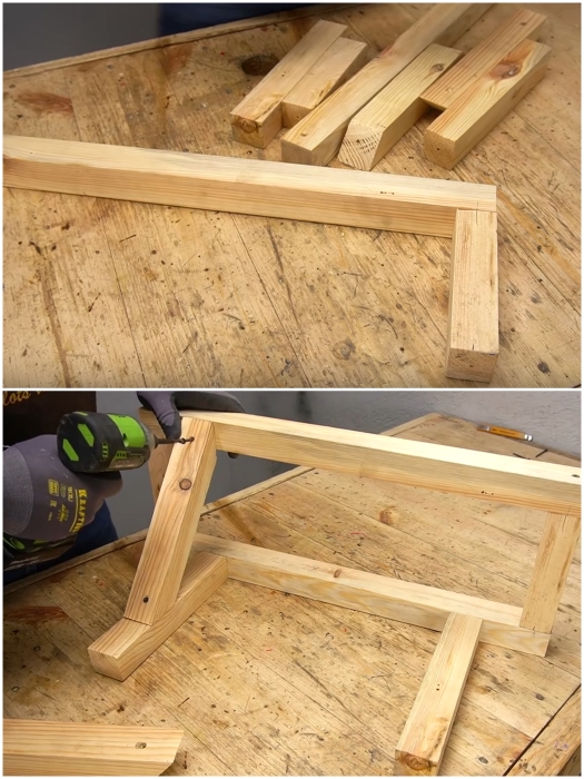 С помощью саморезов нужно собрать каркас из деревянных брусьев. | Фото: youtube.com/ © Men's Craft.По большому счету полка стенд уже готова и если место, которое она занимает вас вполне устраивает, то его можно оставить и так. Но мастер усложнил задачу заранее, придумывая двигающуюся конструкцию, поэтому останавливаться на полпути уже не целесообразно. Тем более, что осталось всего лишь сделать каркас, на котором и будет закрепляться нижняя часть подвесной полки. Для этого понадобится брус, порезанный на нужные детали и саморезы.