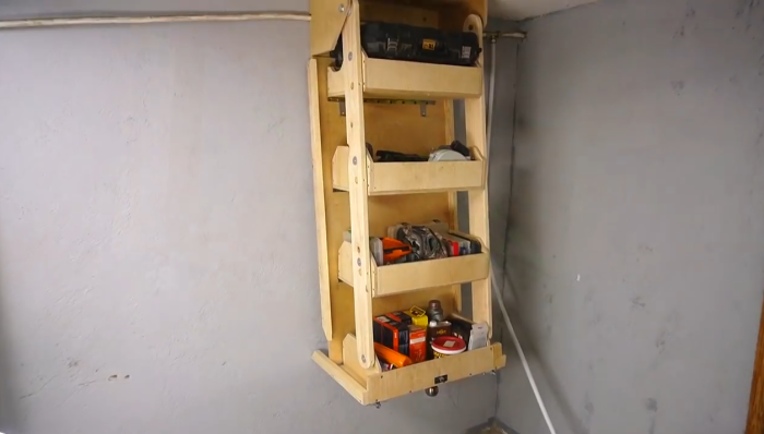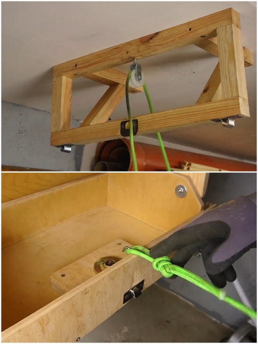 Вместо троса можно использовать крепкую веревку или канат. | Фото: youtube.com/ © Men's Craft.Для того чтобы облегчить подъем на высоту, нужно протянуть крепкий канат или трос через крепежное кольцо в нижнем ящике и ролик на потолке. Вот теперь полка готова, и можно смело складывать весь инструмент или другие нужные вещи.