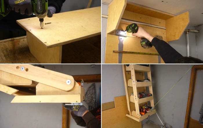 Наш народ от катастрофической нехватки пространства в квартирах, домах или гаражах начинает усовершенствовать различные конструкции и придумывать новые, лишь бы найти местечко для нужных вещей, предметов, инструментов. Дошло уже до того, что системы хранения делают подвесными и хранят все нужное под .потолком. Добротная подвесная система хранения для гаража и не только. | Фото: youtube.com/ © Men's Craft.Если получится сделать добротную полку с подъемным механизмом, то наверняка появится возможность пристроить довольно много нужных вещей, которые будут храниться под потолком и при этом не занимать драгоценное место в шкафу или стеллаже. Для того чтобы справиться с созданием довольно сложной конструкции, достаточно будет загореться идеей и посмотреть мастер-класс, в котором Дмитрий, большой любитель экспериментов, очень доступно все показывает и рассказывает. Древесно-стружечные материалы, электроинструменты, крепежные изделия и фурнитура. | Фото: youtube.com/ © Men's Craft.Для такой самоделки понадобятся:- листы мебельного щита (толстая фанера, плиты ОСБ и т.д.);- деревянные рейки, брус;- рояльные петли, дверные петли, шпингалеты, дверная ручка с защелкой, веревка, блок с роликом;- электроинструменты (шуруповерт, дрель, лобзик, сабельная пила);- крепежные изделия различных типов и размеров, шлифовальная бумага, столярный клей. Сначала нужно вырезать все необходимые элементы и зашкурить торцы. | Фото: youtube.com/ © Men's Craft.Для начала нужно определиться, какой ширины и глубины вы хотите иметь ящики. После этого необходимо раскроить полотно для конструкции верхней части стенда его основной части, деталей укрепленного козырька и 4 ящиков. Торцы всех элементов стоит закруглить или просто зашкурить шлифовальной бумагой. Принцип сборки первого ящика подвесной полки-стеллажа. | Фото: youtube.com/ © Men's Craft.Начинать собирать конструкцию нужно с нижнего ящика.Важно: Стоит обратить внимание, что нижний ящик подвесной полки является частью стенда и по этой причине дно ящика должно быть больше чем у остальных. При этом закреплять боковые стенки нужно с отступом 6-8 см от краев. С помощью рояльных петель ящик закрепляем внизу конструкции. | Фото: youtube.com/ © Men's Craft. На дне и торце нижнего ящика устанавливаем дверную ручку с защелкой. | Фото: youtube.com/ © Men's Craft.После сборки ящик закрепляют на основном полотне с помощью обычных саморезов по дереву и рояльных петель. Это делается на торце (нижняя планка ящика), в который врезается дверной замок с защелкой, а на дне закрепляется ручка. Остальные же ящики собираются стандартно, соединяя детали по торцевой части. На верхнюю часть стеллажа-полки прикручиваем одну часть дверных петель, а по полотну стенда рояльные петли для закрепления ящиков. | Фото: youtube.com/ © Men's Craft.После установки нижнего ящика с другой стороны основного полотна закрепляется большая часть накладной пластины дверных петель. После расчета места размещения остальных ящиков нужно закрепить рояльные петли только с одной стороны. Это облегчит их установку в дальнейшем. Процесс сборки и укрепления козырька для подъемной конструкции полки-стеллажа. | Фото: youtube.com/ © Men's Craft.Для того чтобы закрепить основную часть подвесной полки, на стене нужно собрать конструкцию в виде добротного козырька. Для этого понадобится 4 детали, вырезанные из основного материала. Если в планируемом мест