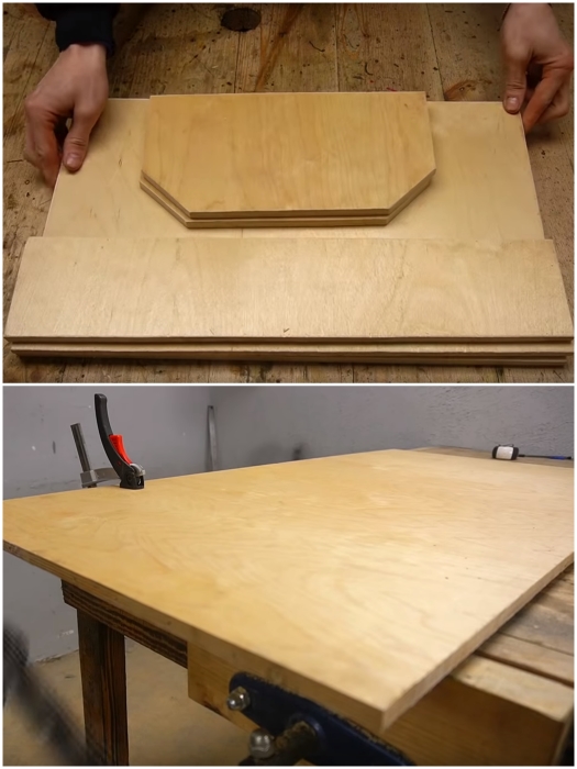 Процесс сборки и укрепления козырька для подъемной конструкции полки-стеллажа. | Фото: youtube.com/ © Men's Craft.Для того чтобы закрепить основную часть подвесной полки, на стене нужно собрать конструкцию в виде добротного козырька. Для этого понадобится 4 детали, вырезанные из основного материала. Если в планируемом месте установки проходят коммуникации, стоит заранее сделать соответствующие отверстия.