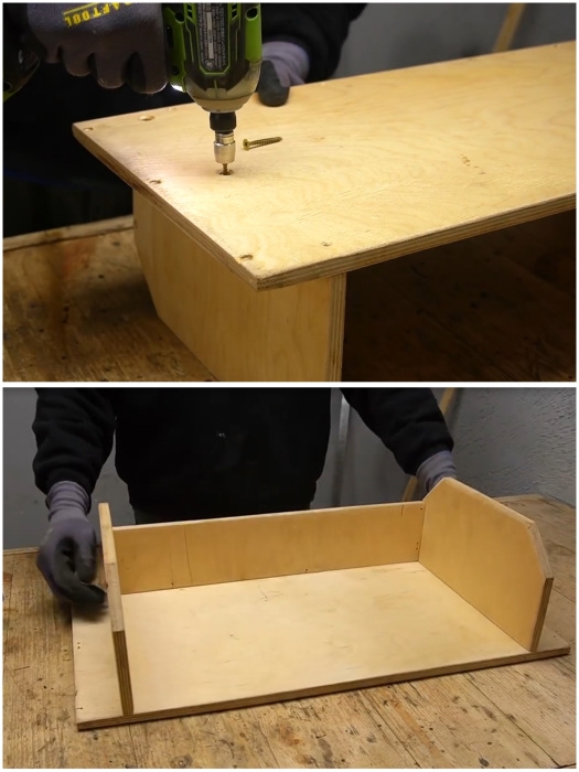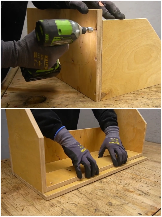 Принцип сборки первого ящика подвесной полки-стеллажа. | Фото: youtube.com/ © Men's Craft.Начинать собирать конструкцию нужно с нижнего ящика.