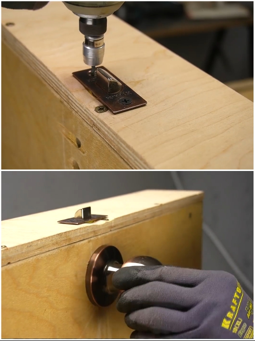 На дне и торце нижнего ящика устанавливаем дверную ручку с защелкой. | Фото: youtube.com/ © Men's Craft.После сборки ящик закрепляют на основном полотне с помощью обычных саморезов по дереву и рояльных петель. Это делается на торце (нижняя планка ящика), в который врезается дверной замок с защелкой, а на дне закрепляется ручка. Остальные же ящики собираются стандартно, соединяя детали по торцевой части.