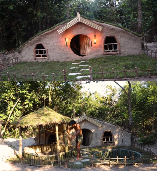 6. Оригинальная усадьба с колодцем и мини-бассейном В одиночку камбоджиец построил дом используя ветки, бамбук, дерн и глиняный раствор. | Фото: youtube.com/ © Tube Unique Wilderness.Судя по всему, камбоджийские аборигены довольно непривередливы, и любая крыша над головой с земляным лежаком станет для них прекрасным жильем. Поскольку джакузи и огромные виллы их не интересуют, они создают довольно милые домики собственными руками. Исключение составляют лишь металлические резаки на палках для копания, которые служат и топором, помогающим срезать стволы бамбука и ветки деревьев, и лопатой. Учитывая, что стволы бамбука довольно прочные и долговечные, их используют и в качестве арматуры, и для создания пола/мебели. На этот раз из них умелец сделал более комфортное ложе, а также укрепил стенки мини-бассейна и собрал настоящую дверь.