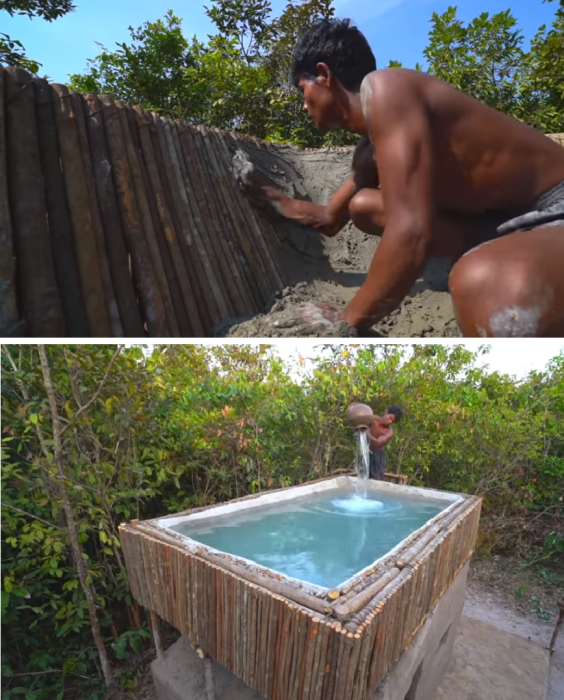 После высыхания своеобразного раствора бассейн заполнили водой и даже немного отдохнули на «кроватях». | Фото: youtube.com/ © Jungle Survival.Также для заполнения водой не понадобится искать (да и негде!) полые бамбуковые стволы, чтобы протянуть импровизированный водопровод.
