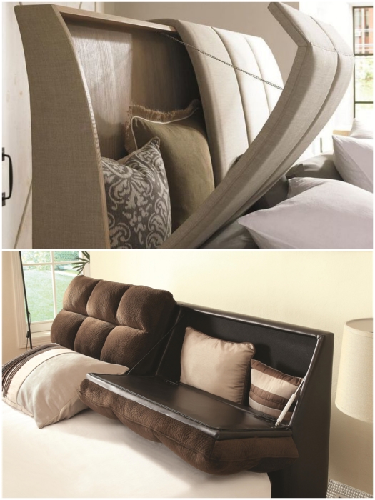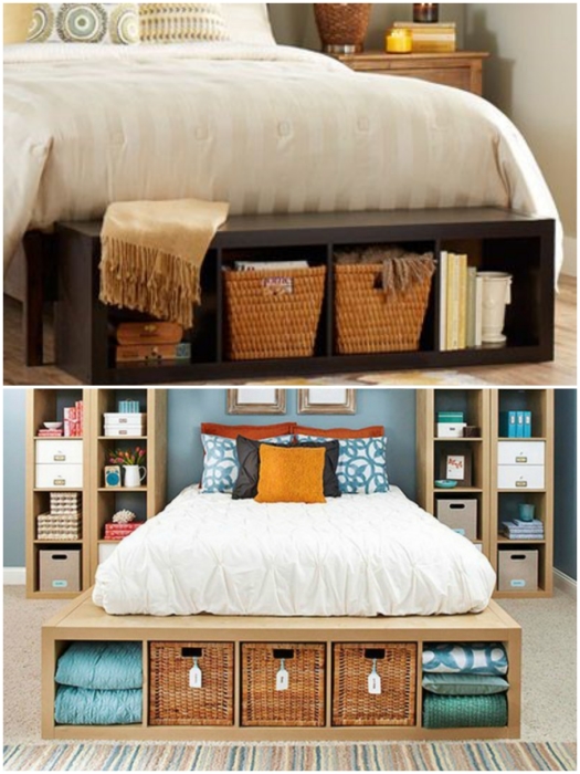 Несмотря на то, что основная функция спальни заключается в обеспечении здорового отдыха и сна, но это вовсе не значит, что ее используют только по назначению. В малогабаритных квартирах спальня – это всегда многофункциональная зона, и от того, как организованы системы хранения, напрямую зависит и порядок, и умиротворяющая атмосфера. И даже если комната совсем мала и не найдется место для установки большого и вместительного шкафа, то несколько скрытых местечек все равно удастся организовать.1. Кровать с подъемным механизмом В кровати с подъемным механизмом можно хранить и постельные принадлежности, и сезонные вещи. | Фото: forum.sdelaimebel.ru/ berloga-mebel.ru.Начнем с самого традиционного способа надежно спрятать крупногабаритные вещи в спальне – с помощью кровати с подъемным механизмом. Это очень удобная и практичная функция такого масштабного предмета мебели, ведь именно он занимает львиную долю пространства в небольшой комнате. Если планируете обустраивать спальню на данный момент, то лучше отдавать предпочтение таким моделям. Да, по цене они будут чуть дороже чем стандартные модели, но потом, когда придет время спрятать зимний вариант одеял или сезонные вещи, то оцените преимущества кровати с большим вместительным ящиком, спрятанным под матрасом. Благодаря разнообразию моделей можно выбрать самую подходящую именно для вас. | Фото: houser.su/ stroy-podskazka.ru.Важно: Если в доме есть мужчина, который владеет инструментом, то запросто можно сделать такую кровать и самому. А способ создания всегда можно найти в интернете.2. Подкроватные ящики Подкроватные ящики всегда помогут спрятать вещи в спальне. | Фото: mebelnuy.com.ua/ planimetria.com.ua.Если замена мебели не входит в ваши планы и приходится довольствоваться тем что есть, то можно найти выход из положения самостоятельно. Обладателям кровати на ножках ничего сверхъестественного придумывать не надо, достаточно будет сделать ящики, которые поместятся под кровать. Подкроватные ящики, впрочем, как и саму кровать можно сделать самостоятельно. | Фото: novamett.ru/ matrason.ua. Под кровать можно пристроить все что есть, только не стоит забывать о стиле оформления комнаты. | Фото: pinterest.co.uk/ remont-samomy.ru.Если нет вдохновения или возможности смастерить ящики самостоятельно, то можно подобрать выдвижные детали из старой мебели или пристроить несколько контейнеров/коробок. Особого колорита интерьера придадут плетенные корзины, но их желательно подбирать одного размера и фактуры, чтобы не было разнобоя. 3. Спальное место на подиуме Функциональность кровати возрастает если ее поместить на подиум. | Фото: Stroy-podskazka.ru/ pinterest.com.Если в комнате катастрофически не хватает места и для кровати, и для шкафа, то можно совместить приятное с полезным. Для этого нужно поднять кровать на подиум, и чем выше он будет, тем больше вещей получится спрятать. Единственное, о чем предупреждают авторы Novate.Ru, не сильно увлекайтесь высотой мало того, что это может не очень красиво выглядеть, так и спать под потолком не очень-то комфортно. Если есть возможность устроить спальное место на втором ярусе, то площади для передвижения и хранения значительно прибавится. | Фото: pinterest.com/ kvartblog.ru.Исключения составляют вторые ярусы, когда высота позволяет и нужно освободить напольное пространство. Как правило, такие площадки делают самостоятельно или приглашают мастера, поэт
