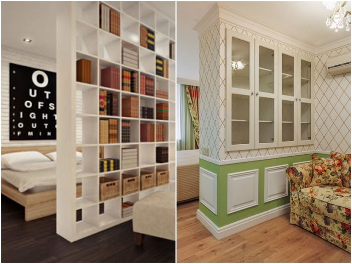 Узкую длинную комнату можно разделить с помощью стеллажей/сервантов. | Фото: kvartira.mirtesen.ru / classicmebel21.ru.Вот для этих целей использовать лучше не обычную ширму или штору, а полноценный стеллаж или двусторонний шкаф. Таким образом убивается два зайца сразу – и разделили пространство, и спрятали кучу вещей.