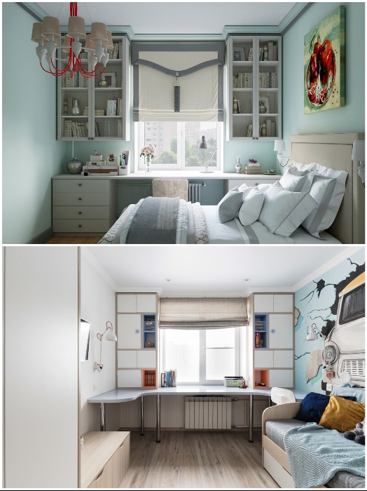 Под окном можно сделать диванчик или лавку с выдвижными ящиками или полками. | Фото: berkem.ru/ design-homes.ru.Важно: В стремлении сэкономить побольше места многие устанавливают громоздкие и максимально вместительные шкафы, но этого делать не стоит если комната совсем крошечная. Чтобы визуально уменьшить массив мебели, ее лучше подбирать в тон стенам и отдавать предпочтение лаконичным и изящным шкафчикам.При оформлении спальни как и любой другой комнаты надо помнить, что не стоит бездумно гонятся за модой, ведь некоторые ее тренды так скоротечны, а жить придется с ними не один год.