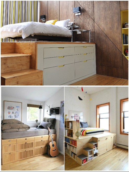 Функциональность кровати возрастает если ее поместить на подиум. | Фото: Stroy-podskazka.ru/ pinterest.com.Если в комнате катастрофически не хватает места и для кровати, и для шкафа, то можно совместить приятное с полезным. Для этого нужно поднять кровать на подиум, и чем выше он будет, тем больше вещей получится спрятать. Единственное, о чем предупреждают авторы Novate.Ru, не сильно увлекайтесь высотой мало того, что это может не очень красиво выглядеть, так и спать под потолком не очень-то комфортно.