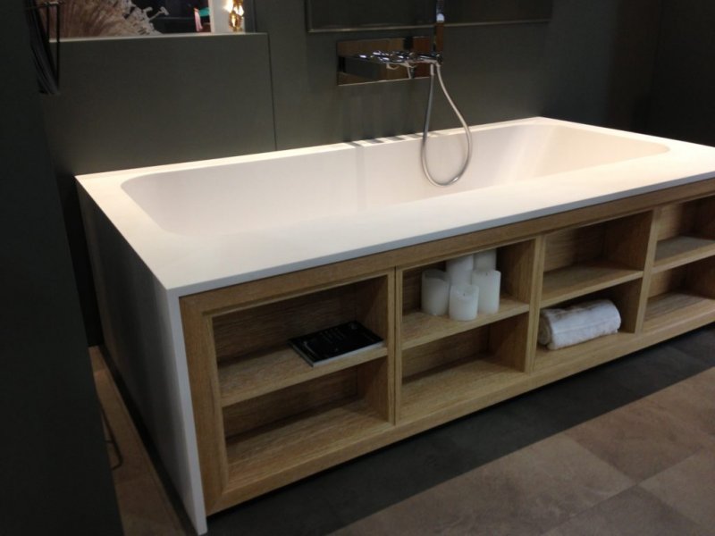 Глухой экран – сплошное сооружение. Его можно задекорировать тем же материалом, который был использован для отделки стен ванной комнаты. Этот вариант позволяет гармонично встроить ванну в дизайнерскую композицию.