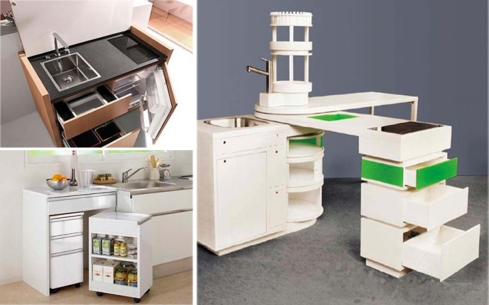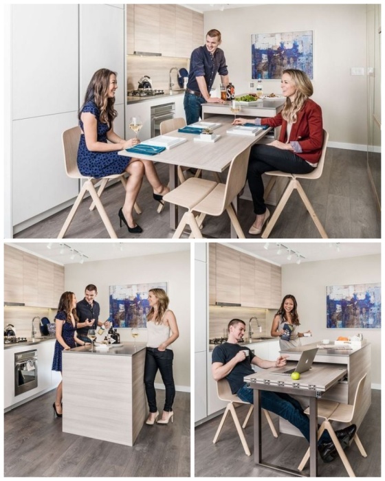 Кухонный остров-трансформер может быть и рабочей и обеденной зоной. | Фото: cpykami.ru.Какой бы крошечной квартира не была, но без кухни обойтись нельзя. И даже если это будет студия меньше 20 кв.м, обустроить полноценный кухонный уголок можно без проблем если знать, что существует смарт-мебель.