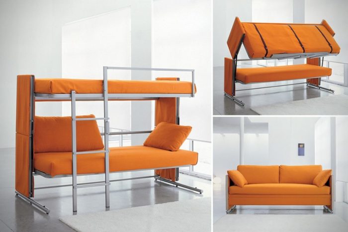 Диван может трансформироваться в двухъярусную кровать. | Фото: poztelio.com.Совет от Novate.Ru: Нужно учитывать, что покупка 2-3 стандартных единиц мебели обойдутся несколько дороже, чем один диван-трансформер. При этом также не стоит забывать, что места для расположения всего необходимого добра может просто не хватить.