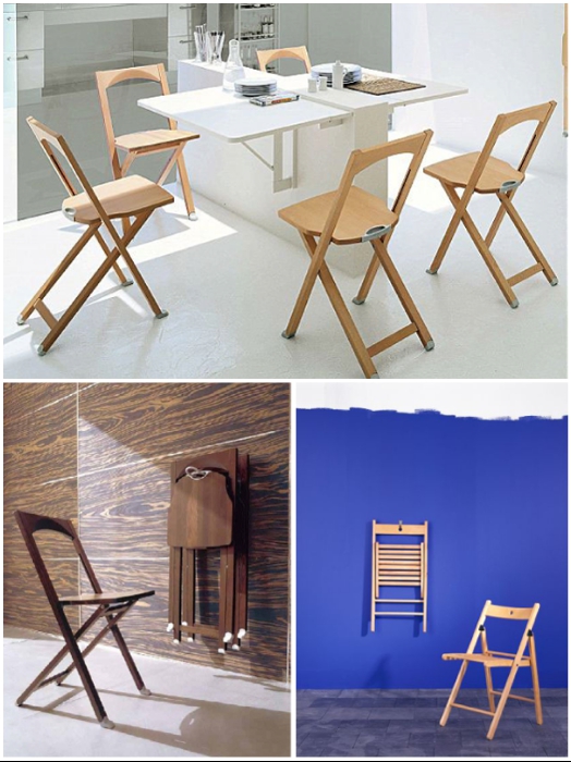 Полноценные раскладывающиеся стулья можно хранить просто на стене в сложенном виде. | Фото: dikovin-ka.ru.Начнем свое знакомство с «умной» мебелью со стульев. Именно этот предмет мебели оказывается на пути следования, особенно если пытаются обзавестись дополнительными единицами на случай большого застолья.