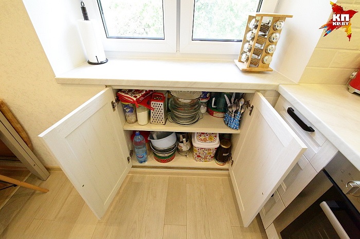Ящик с полками под подоконником. / Фото: Ryazan.kp.ruНа маленькой кухне главной проблемой является хранение. Ведь чтобы разместить посуду, кухонные гаджеты, продукты питания, полотенца и прочие нужные предметы двух шкафчиков явно будет маловато. Помочь в этой ситуации сможет подоконник (но лишь в том случае, если под ним не располагается батарея). Площадь под ним можно использовать для установки дополнительного шкафа, высота которого будет чуть меньше высоты подоконника. Лучше всего подбирать мебель в едином стиле с кухонным гарнитуром – так интерьер кухни будет смотреться целостным и гармоничным, а новая система хранения не выбьется из общей картинки. Также под подоконником отлично будет смотреться посудомоечная или стиральная машина (если для нее не нашлось места в ванной).Если вам не нравится ни один из предложенных вариантов, используйте подоконник в качестве полочки. Разместите там красивые контейнеры с крупами, чай, кофе в керамических баночках, специи. Лучше всего подбирать емкости из одного набора. Обращайте внимание на цвет – он должен гармонично вписываться в интерьер. Кстати, если кухня оформлена в светлых оттенках, контейнеры могут стать яркими акцентами.
