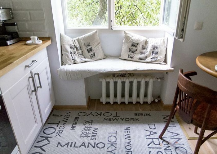 Уютная скамья для сидения на кухне. / Фото: Build-together.ruНеобычный, но не менее эффективный вариант использования подоконника – скамья. Правда, он подходит для кухонь, которые отличаются средними габаритами (для маленьких помещений – это слишком большая роскошь). Перед тем, как превращать подоконник в скамью, измерьте его высоту (она должна быть примерно 45 см). Чтобы скамья было не только красивой, но и устойчивой, используйте деревянное сидение. Также необходимо побеспокоиться и о своей безопасности. Для этого установите на окна решетки. Чтобы они не выбивались из интерьера и подчеркивали стилистическое оформление комнаты, подбирайте экземпляр в тон.Если вариант со скамьей вам не нравится, сделайте из подоконника мягкую софу. Принцип такой же, только деревянное сидение нужно будет затянуть матрасом из ткани и положить несколько диванных подушек. Просто, уютно и со вкусом.Возможно, еще вам понадобятся 6 советов, как оформить кухню площадью 4 кв. м. в хрущевке