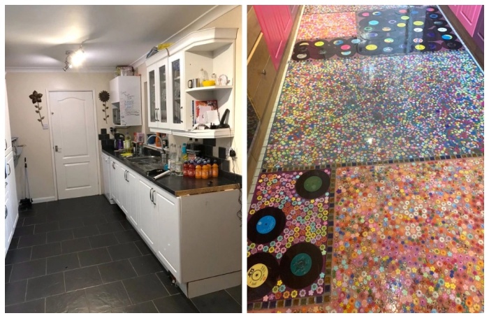 Соня Бартон решила отомстить мужу-изменнику и замуровала его любимую коллекцию пластинок в напольное покрытие. | Фото: реbigpicture.ru.Творческая натура британки Сони Бартон (Sonia Barton) из Белпера, что в графстве Дербишир, придумала довольно эксцентричную месть для мужа-изменника. Чтобы хоть как-то развеяться и утешиться сразу после развода, мать троих детей решила сделать ремонт в ненавистной черно-белой кухне. Она довольно жизнерадостный человек, который любит яркие цвета и разнообразие, поэтому и постаралась сделать дизайн кухни под стать своему видению мира.