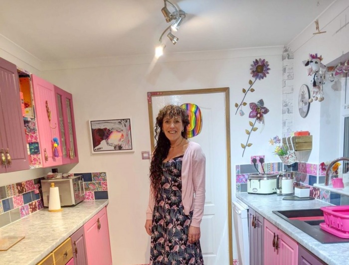 Соня Бартон собственноручно перекрасила дверцы в любимый цвет, разрисовала кафель и сделал декупаж на торцах гарнитура. | Фото: storytrender.com.Для начала она сняла старый кафель и на полу, и на стенах, потом перекрасила дверцы кухонного гарнитура в свои любимые цвета – розовый и фиолетовый. На торцах сделала мозаику из лоскутов яркой ткани в технике декупаж.Справка: Декупаж — техника декорирования предметов с помощью нанесения рисунка, картин или орнамента, сделанного на ткани, бумажной салфетке или любом другом материале. Как правило, полученный результат после высыхания клея/краски вскрывают лаком или эпоксидной смолой, чтобы на дольше сохранить рисунок и придать композиции особенный визуальный эффект.