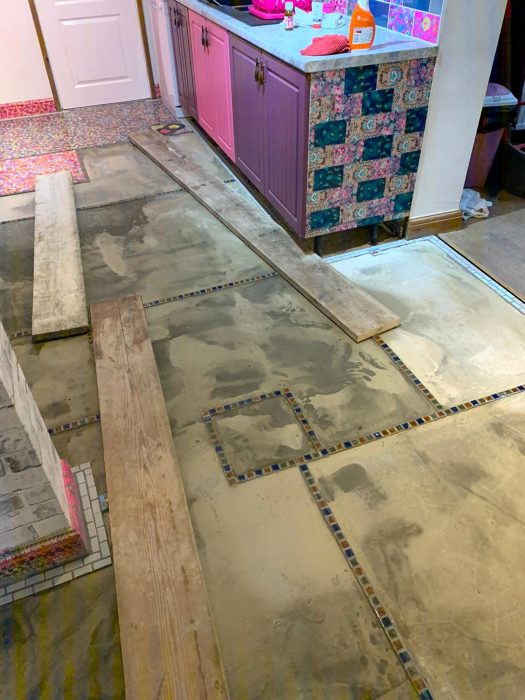 Креативная женщина решила сделать каждую секцию пола с различным рисунком. | Фото: storytrender.com.Больше всего времени заняла укладка пола. Учитывая, что Соня противница однообразия, то не стал удивлением отказ от использования только лишь виниловых пластинок в качестве украшения напольного покрытия. Она задумала неординарную композицию, состоящую из нескольких зон. Для начала она разбила площадь пола на квадраты с помощью крошечной мозаичной плитки из стекла, которая продается отдельными ячейками.