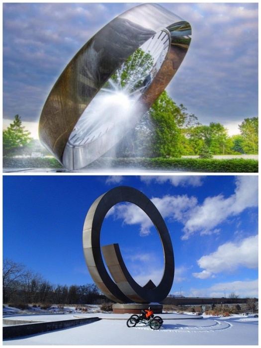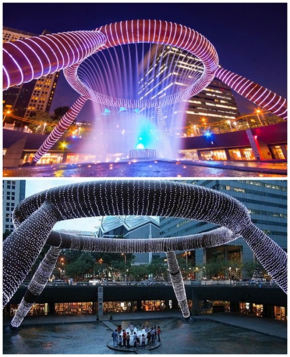 Фонтан Джули Пенроуз расположен в центре огрода Колорадо-Спрингс (штат Колорадо, США). | Фото: sreda.temadnya.com/ yavarda.ru.Необычный фонтан был построен в 2007 г. в центре Колорадо-Спрингс. Его создание посвятили Джули Пенроуз (1870-1956 гг.) – известной филантропке, благодаря которой развивался сам город. Отсюда и такое название «Julie Penrose Fountain», хотя путешествующий народ больше привык его называть «Непрерывный» (Continuum) из-за постоянного движения самой конструкции. Столь удивительный дизайн придумали архитекторы Дэвид Барбер и Билл Бургесс. Его оригинальность заключается и в необычных формах, и в том, что он постоянно движется. Он больше похож на фрагмент одного витка спирали и состоящий из 366 струй воды. Это необычное кольцо за 15 минут совершает полный оборот вокруг своей оси, создавая захватывающее зрелище.