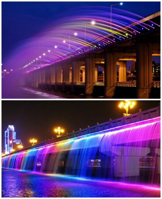 Фонтан «Банпо» не просто фонтан – это мост из воды всех цветов радуги. | Фото: ggneznakomka.livejournal.com/ yandex.ru.Это еще один фонтан-рекордсмен только попал он Книгу рекордов Гиннеса из-за своей длины. Он больше похож на настоящий мост из воды протяженностью 1140 м, причем каждый участок имеет свою цветовую палитру. Таким образом получается восхитительное зрелище – грандиозный водный мост всех цветов радуги. Чтобы создать такое цветовое представление понадобилось установить более 10 тыс. мощных светодиодных ламп, так что свое название «радуга под лунным светом» он вполне оправдывает.