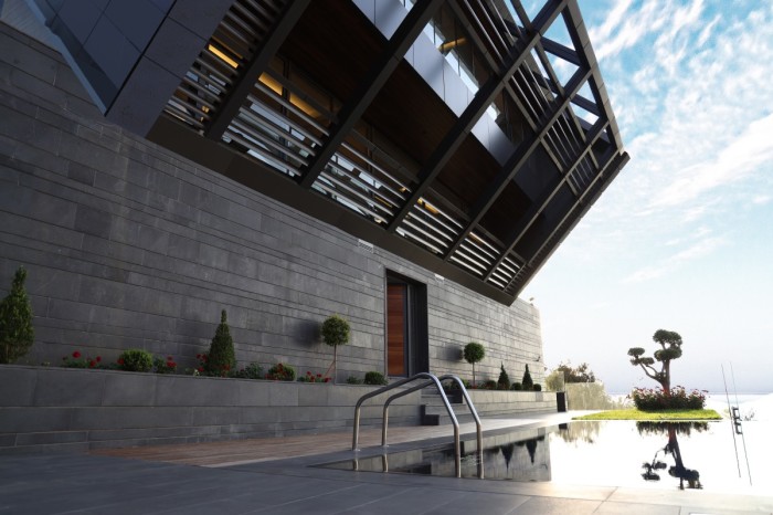 С одной стороны основного здания особняка сделаны открытые площадки, а с другой – лестница (CH730 Villa, Ливан). | Фото: e-architect.co.uk.Изюминкой новой резиденции является бетонная дорожка, сменяющаяся ступенями, идущими с внешней стороны дома к пейзажному бассейну. Лестница имеет четкое ограничение, ведь сразу за опорно-защитной стеной начинается обрыв. Поэтому само спускание по этой дорожке-лестнице обеспечивает невероятными ощущениями, не говоря о бассейне, выложенном иссиня-черным гранитом придающим особенной глубины воде. С другой стороны дома на каждом уровне сделаны открытые террасы, на которые есть выходы с каждого этажа и яруса особняка.