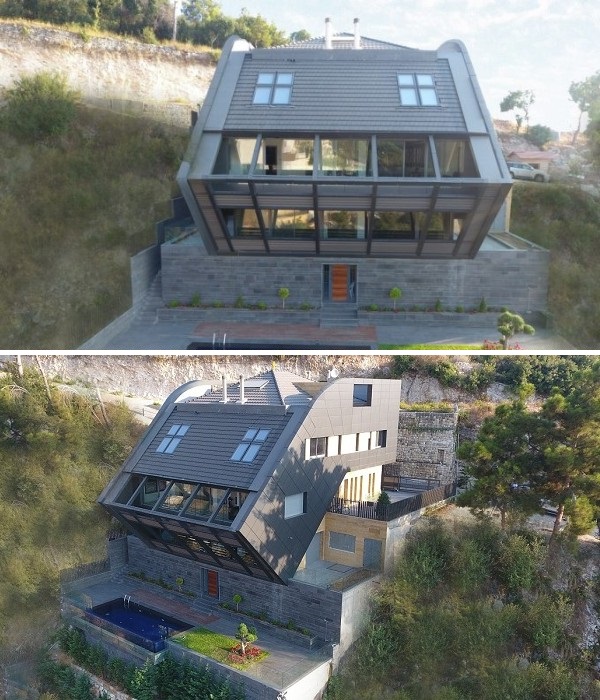 Если подъехать со стороны деревеньки Чнанир, то дом выглядит вполне современно и стандартно (CH730 Villa, Chnaniir). | Фото: newatlas.com.Подъездная улица со стороны населенного пункта упирается в ворота вполне обычного дома с современной планировкой. Но с северной стороны, находясь в долине у подножия горного хребта подняв голову вверх, можно действительно ужаснуться, ведь часть дома свисает над пропастью. И возникает стойкое ощущение, что дом вот-вот упадет с края утеса.