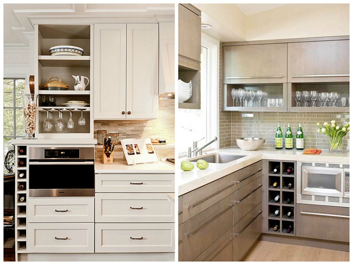 Открытые шкафчики делают пространство просторнее. / Фото: kitchensinteriors.ruЭтот совет особенно актуален для небольших кухонь, которые чаще всего встречаются в хрущевках. Массивные навесные шкафчики визуально уменьшают пространство, делают комнату менее просторной. Чтобы кухня казалась большой и светлой, избавьтесь от дверок и оставьте от шкафчиков только «коробки». Такой вариант также подойдет хозяйкам в том случае, если дверцы потеряли свой презентабельный внешний вид, а каркасы находятся в хорошем состоянии.Чтобы придать интерьеру изюминку, покрасьте или оклейте обоями внутренние поверхности шкафчиков. Так они будут выглядеть очень стильно, красиво и станут замечательным акцентом в комнате.