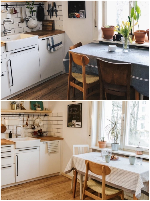 Обеденный стол и стулья оставили от прежних хозяев. | Фото: instagram.com/ © hudalukna.Обеденную зону решили сделать у окна, которое тоже пришлось приводить в порядок. На металлопластиковые рамы его не стали менять, потому что молодым людям хотелось больше натуральности, также они оставили старый стол и стулья. Поскольку старая мебель была достаточно добротная, руки не поднялись ее выбросить на помойку. Конечно же их отмыли, где надо подкрасили или вскрыли лаком и организовали прекрасный обеденный уголок.