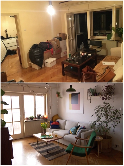 Во время ремонта с гостиной было меньше всего проблем. | Фото: instagram.com/ © hudalukna.После ремонта в кухне остальные комнаты показались просто раем, ведь в них не нужно было менять коммуникации, да и паркет на полу довольно хорошо сохранился. Им оставалось только снять старую краску на окнах и дверях и лак на паркете, все освежить и создать ту обстановку, о которой мечтали.
