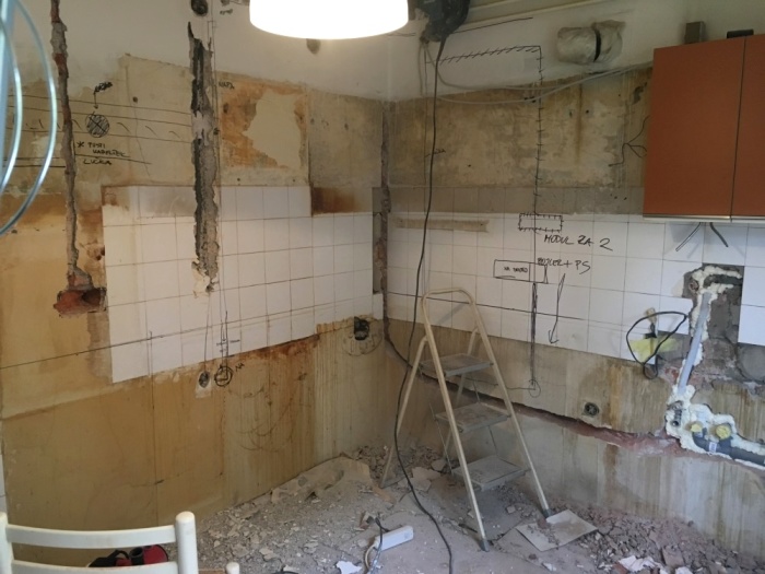 Ремонт решили начать с полной заменой коммуникаций и проводки на кухне. | Фото: lemurov.net.Особенно радовал ребят тот факт, что они смогут реализовать свою мечту и самостоятельно создать дизайн квартиры в скандинавском стиле, ведь помещение это позволяло сделать. Творческая натура Нины всегда требовала реализации, еще проживая на съемной квартире она начала собирать интересные предметы кухонной утвари и всевозможные милые безделицы, которые теперь можно будет использовать при обустройстве собственного жилья. А Яна всегда привлекали оригинальные идеи, которые можно воплотить в жизнь собственными руками.