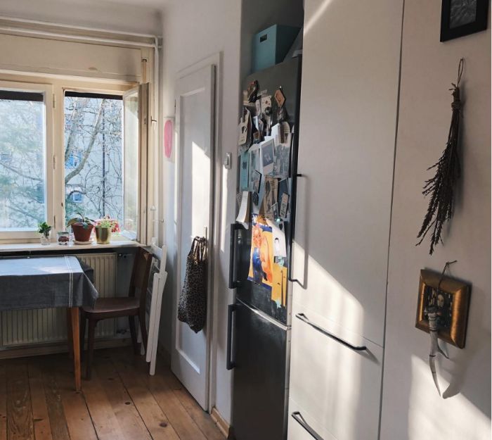 Холодильник пристроили в нишу, расположенную у входа в кухню. | Фото: instagram.com/ © hudalukna.Молодой человек очень хотел, чтобы в кухне были полы из натурального дерева, но оказалось, что это дорогое удовольствие, да и не всегда доски можно установить из-за маленькой глубины стяжки. Но когда Ян начал снимать старое верхнее покрытие оказалось, что под ним находится дощатый пол с прекрасно сохранившейся древесиной. И самое интересное между покрытием были разложены газеты, датируемые 1954-1956 гг., так что теперь ребята точно знали, когда на кухне делался последний грандиозный ремонт.