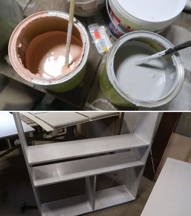 Для покраски деревянных поверхностей лучше использовать специальные валики. | Фото: youtube.com/© Bubenitta.Поскольку секретер предназначается для дочери Надежды девушки, решили, что внутренняя часть будет нежно персикового цвета, а фасады, просвет и торцы – бледно-серого. Чтобы краска смотрелась более плотной и однородной, нужно вскрывать в 2-3 слоя, при этом каждому слою необходимо дать время на полное высыхание.