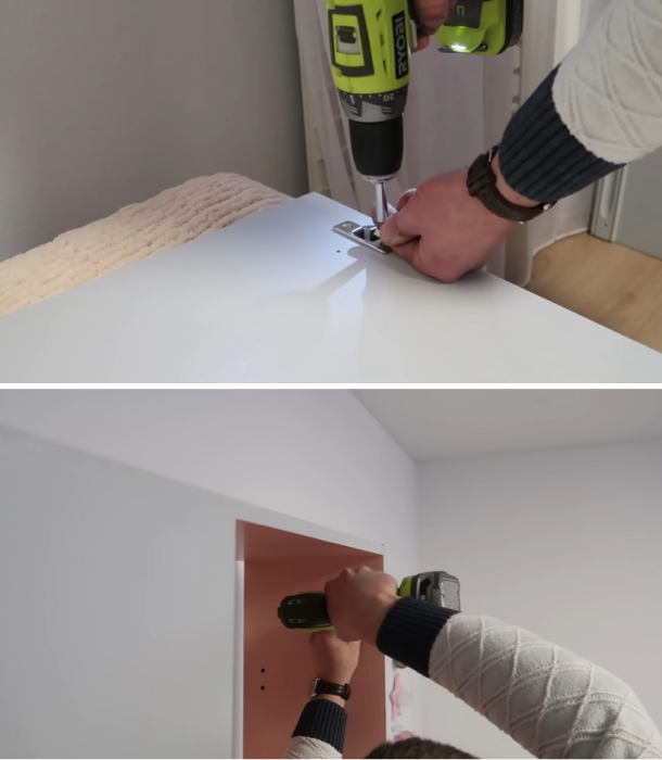 Процесс сборки и регулировки снятых деталей секретера. | Фото: youtube.com/© Bubenitta.После того, как высохли все поверхности, можно приступать к сборке. Все детали и механизмы, которые приобрели для замены или оставили старые, нужно установить на место и отрегулировать открывающие элементы.