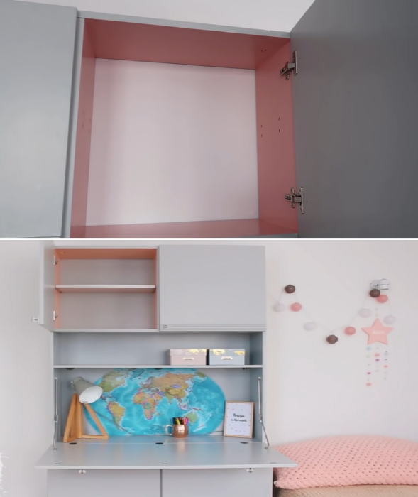 Вот такое современное и удобное рабочее место получилось из старого секретера. | Фото: youtube.com/© Bubenitta.После сборки конструкции секретера мастерице захотелось добавить функциональности и цвета, поэтому она поместила на заднюю стенку рабочей зоны политическую карту мира и сделала отверстия для проводов, чтобы подключить настольную лампу.Поскольку Надежда обустраивает комнату для своей дочери – это не первая ее переделка старой советской мебели. До этого она обновила платяной шкаф