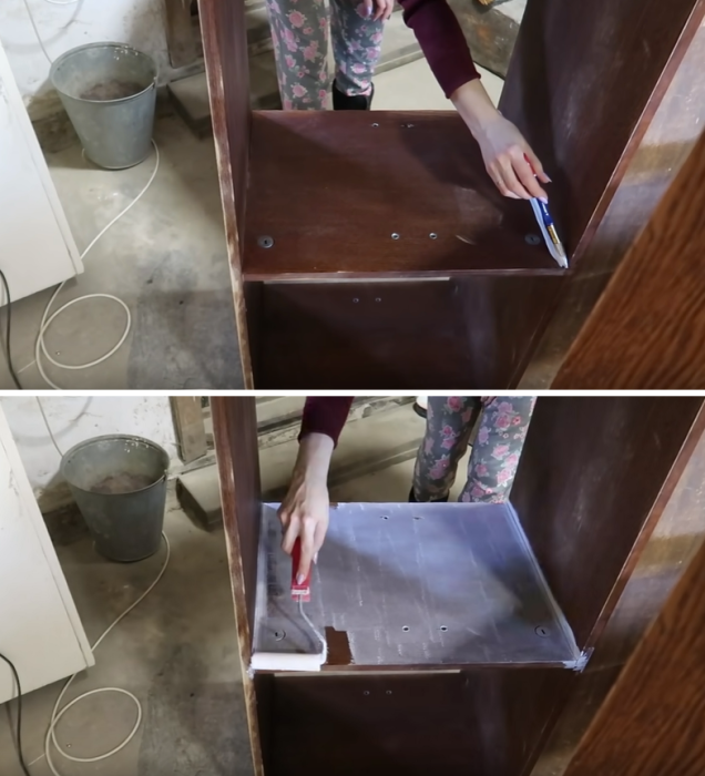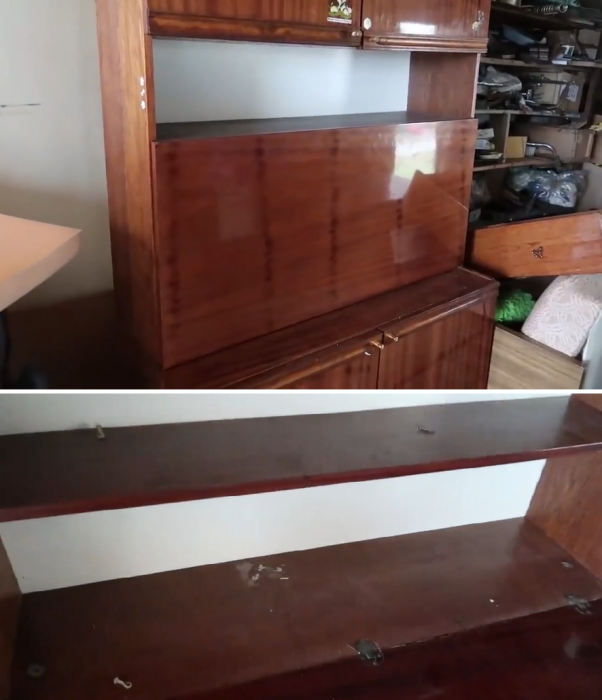 Для начала нужно полностью разобрать секретер. | Фото: youtube.com/© Bubenitta.Итак, чтобы обновить потрепанный и устаревший секретер, нужно его аккуратно разобрать на детали освободив от креплений, петель, ручек, магнитов, молдингов и т.д. Для ускорения процесса лучше использовать шуруповерт, но будьте готовы к тому, что грани крестовины в старых шурупах могут быть сорваны. Поэтому следует запастись еще и плоскогубцами.
