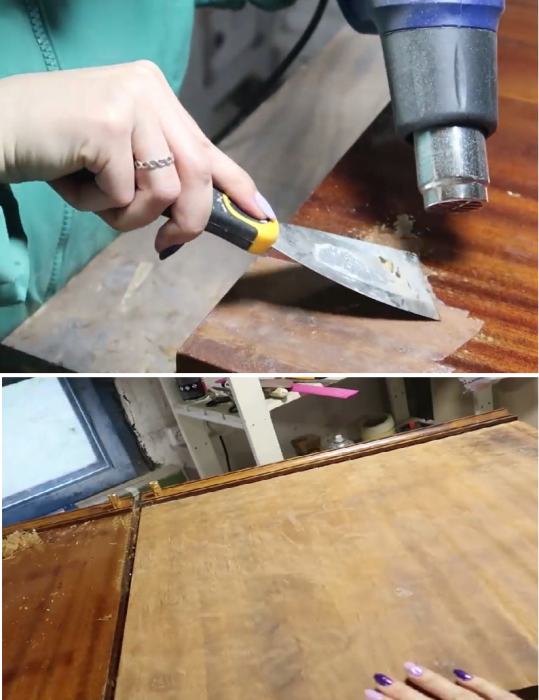 Неважно, каким способом, но лак нужно аккуратно и тщательно снять с поверхности фасадов. | Фото: youtube.com/© Bubenitta.После разборки можно начинать снимать слой лака, который украшал фасады секретера. Если это советский вариант, то слой будет довольно толстым, ведь в те времена подобные детали заливали эпоксидной смолой для блеска и лучшей защиты. В выполнении этого процесса Надежда пошла по самому сложному пути, она решила снимать лак с помощью строительного фена и шпателя. Одев очки, маску и перчатки, прогревая небольшой кусочек покрытия, нужно аккуратно счищать пузырящийся материал. Стоит обратить внимание на то, чтобы движения шпателя/ножа были вдоль волокон шпона, в противном случае избежать сколов не удастся.
