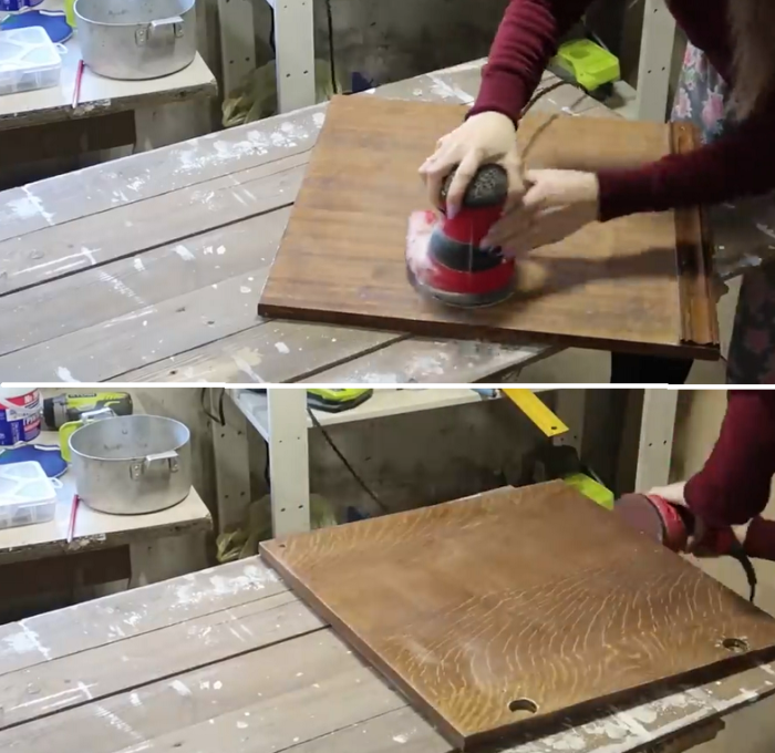 Все элементы секретера нужно хорошенько отшлифовать. | Фото: youtube.com/© Bubenitta.Внутреннее пространство самого секретера и полок, как правило, не покрывались лаком, поэтому их достаточно будет отшлифовать с помощью наждачной бумаги или шлифовальной машины. Также пройтись по торцам и поверхностям.