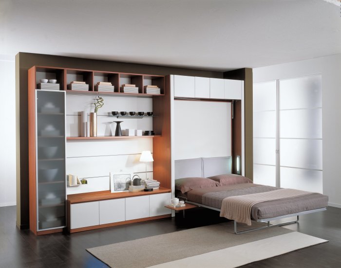 В дневное время помещение используется как гостиная, а с приходом ночи превращается в уютную спальню. /Фото: polzavizit.ruСовмещение гостиной и спальни — не редкость для квартир небольшой площади. Настенная кровать в этом случае отлично совмещается с соседствующими полками или шкафчиками. Современные производители выпускают настенные кровати различных моделей и с различными механизмами управления: с горизонтальным или вертикальным.Полезный совет от Novate.ru: Наиболее актуальный выбор — настенная кровать с горизонтальным открыванием. Преимущество горизонтальной системы перед вертикальной очевидны — в первом случае уменьшается нагрузка на подъемный механизм. Таким образом кровать прослужит дольше. Кровать с вертикальной системой подъема используют в том случае, когда площадь комнаты очень маленькая и нет возможности использовать другой вариант.