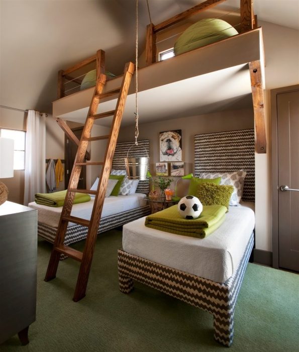 Оптимальное расположение кроватей и зоны для игр. /Фото: thearmchairlibrarian.comДетская комната — это особое помещение. Детям необходимо как активно двигаться, так и выполнять домашние задания. Максимальное использование полезной площади особенно актуально, если в комнате живут несколько детей. В этом случае кровати располагаются на двух этажах и соединяются между собой лестницей. Второй уровень может быть использован и как игровая зона.