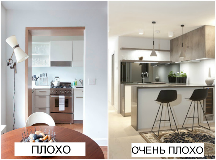 Ошибки при обустройстве кухни, которые могут стать роковыми.Затевая ремонт на кухне, нужно учитывать немало деталей, начиная от расположения розеток и заканчивая выбором фактуры мебели. Недостаточно просто представить картинку и пойти выбрать кухонный гарнитур. Мы собрали 7 ошибок при ремонте кухни, которые превратят жизнь в бесконечную уборку.1. Темная глянцевая кухня Темный глянцевый гарнитур на кухне. | Фото: ModernPlace.ru.Покупать темный глянцевый гарнитур стоит только в том случае, если вы готовы стать рабом уборки или, если можете закрыть глаза на все и принять мысль, что такой глянцевой и блестящей, как в первые недели она больше не будет никогда. Нет, мы согласны, темные глянцевые фасады выглядят роскошно, но они совершенно не пригодны для обычной жизни. Только представьте, каждое ваше прикосновение останется отпечатком на дверце, брызги жира превратятся в белые подтеки, а капли воды - в мутные разводы. А еще вы воочию сможете увидеть, как быстро в вашей квартире появляется пыль, а она, уж поверьте, появляется очень быстро. 2. Кухня без двери Отсутствие двери. | Фото: Дизайн Мания, HappyModern.RU.Отсутствие двери делает кухню более современной и просторной. Более того, иногда отсутствие стены и дверного проема - вынужденная мера, к которой приходится приспосабливаться. Стоит отметить, что приспособиться бывает весьма непросто. Если вы всерьез намерены отказаться от двери, спросите у себя, готовы ли вы засыпать под ароматы рыбы или жареной картошки, работать под звон моющейся посуды или шкварчащей сковородки. А еще приготовьтесь к тому, что в зимний период в вашей квартире станет прохладней, ведь обогреть и сохранить тепло, легче на маленькой площади, чем на большой.3. Раковина у окна Кухонная мойка у окна. | Фото: БэбиБлог, Pinterest.По мнению Novate.ru, идею установки кухонной мойки у окна нельзя назвать полностью провальной, ведь у подобного размещения есть неоспоримые плюсы. Например, смотреть в окно, натирая тарелки - куда приятнее, чем пялиться в стену; в дневное время вы получите источник хорошего, естественного света и экономию пространства. Кажется, вполне себе жизнеспособная идея, но есть и некоторые минусы. Один из главных - вечно грязное окно. Плюс, для того чтобы перенести мойку к окну, нужно существенно изменить коммуникации - это деньги и риски. Ну, и напоследок, над такой мойкой не повесишь сушилку, придется устанавливать ее сбоку, что может не очень удобно.4. Стеклянный стол Стеклянный стол на кухне. | Фото: Яндекс.Стеклянная мебель, безусловно, красива, кроме того, она выглядит намного легче, чем предметы из других материалов. Но стеклянный стол на кухне - далеко не самая практичная идея. Во-первых, стеклянную поверхность легко повредить: царапины от ножа, сколы от ударов тяжелой посуды, мелкие потертости и так далее. Во-вторых, пятна на стекле намного заметнее, а от мокрой тряпки всегда остаются разводы. И напоследок, известны случаи, когда столешница трескалась от контакта с горячей посудой, несмотря на то, что материал закаленный.5. Открытые полки Открытые полки на кухне. | Фото: YellowHome.ru.Открытые полки и все, что на них, выглядит как украшение интерьера. Кроме того, они добавляют интерьеру изящества и легкости. Но кроме красоты вы получите и дополнительные хлопоты, связанные с уборкой. Дело в том, что все открытые поверхности необходимо ежед