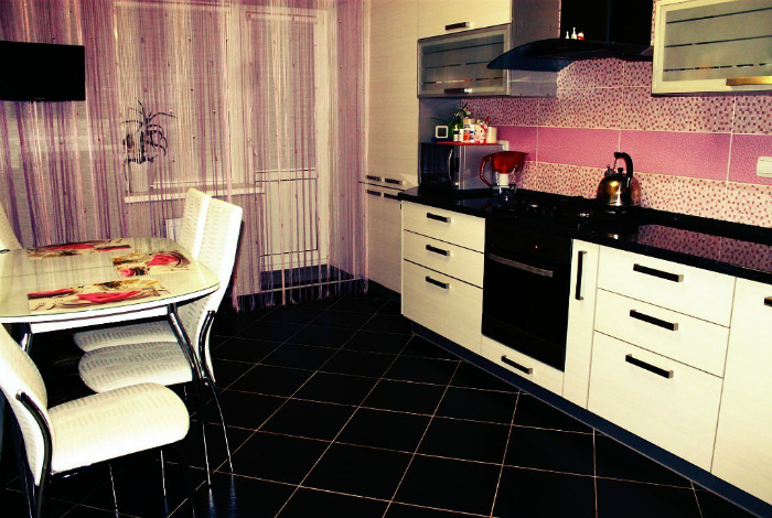 Темный пол в кухне. | Фото: Dekoriko.Ru.Темный пол выглядит очень эффектно. Кроме того, этот цвет оттеняет все остальные цвета, делая их ярче и заметнее. Но вот незадача, темный пол придется мыть ежедневно и это не преувеличение. Неважно, матовый или глянцевый, из какого материала он сделан, если он темный, на нем будет заметна каждая пылинка, шерстинка и пятнышко.