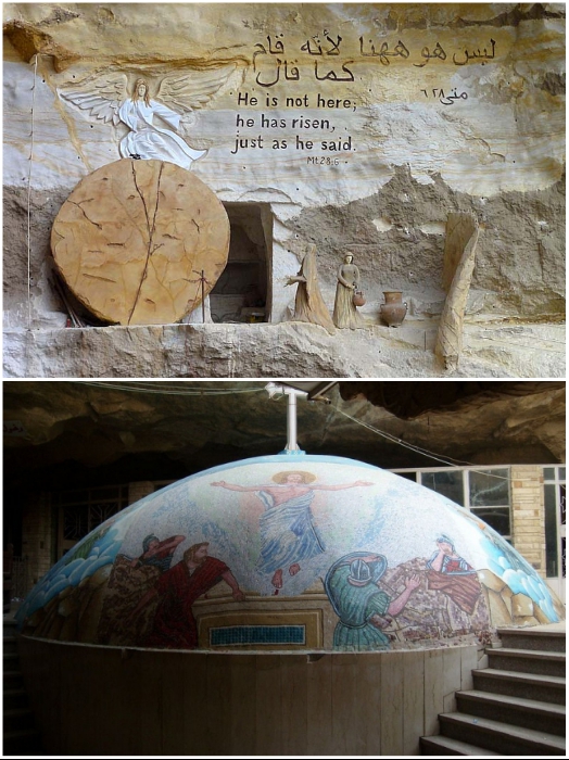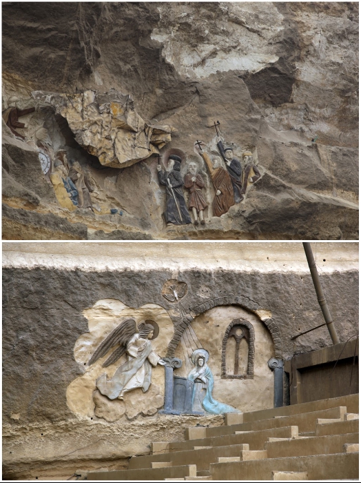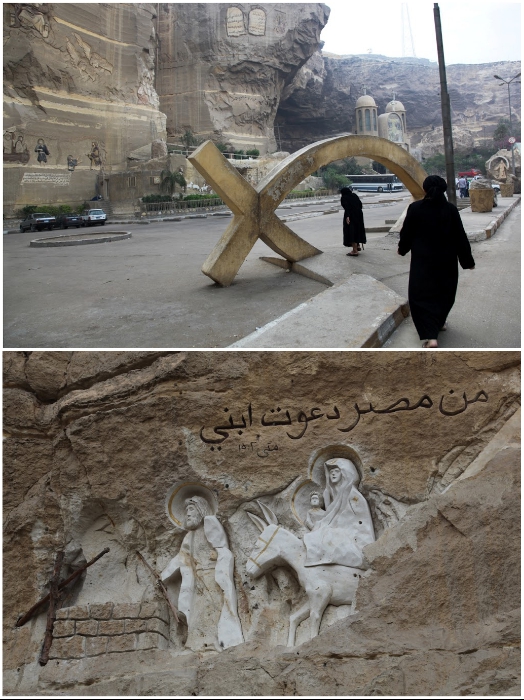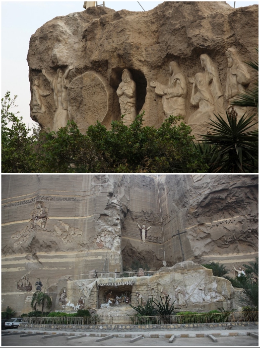 Статуи и барельефы, вырубленные из горной породы, украшают комплекс Мукаттама (Каир, Египет). | Фото: v-hrame.livejournal.com.Нашлись мастера, которые смогли вырезать в горной породе огромный монастырь и несколько церквей и часовен. Рядом начали строить каменные дома, которые были более надежными, да и вместить большее количестве семей. Уже к 90-м годам жителей этого города насчитывалось около 20 тыс., потому что в мусульманской стране найти христианские святыни мало где встречаются, поэтому копты съезжаются в это место. Несмотря на такое малоприятное занятие и горы мусора окружающие их храм они очень набожный народ и стремятся держаться вместе.