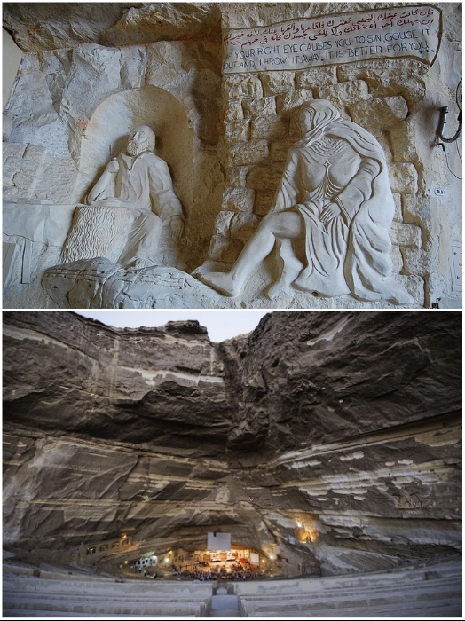 Амфитеатр основной церкви занимает площадь более 1 тыс. кв. м. (храм Св. Симеона, Каир). | Фото: wikimapia.org/ omyworld.ru.За эти годы город разросся и в нем уже проживает около 30 тыс. человек, ведь этим людям разрешено поселяться в нем официально, хотя он больше похож на свалку нежели на населенный пункт. Улицы и первые этажи завалены горами мусора, который издает зловонный запах, но стоит только покинуть пределы последнего квартала, перед входом открывается удивительная красота пещерного комплекса Мукаттама. Его стены и отроги украшены огромными барельефами и скульптурами на библейские сюжеты, которые создал польский священник Мариуш, живущий в Каире.
