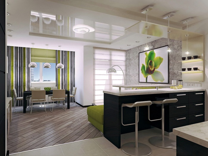 Визуальное разделение пространства при помощи разного напольного покрытия. / Фото: Hochu.uaРазделение может быть визуальным или физическим. В первом случае кухня будет более просторной, так как ее пространство ничем не ограничится. Границу можно обозначить при помощи контрастной цветовой гаммы: например, постелить разные полы на кухне и в гостиной или провести зонирование при помощи настенного покрытия. При этом очень важно подбирать оттенки, которые будут хорошо гармонировать между собой. Если боитесь не угадать, выберете нейтральные цвета: например, кухню можно оформить в белом цвете с яркими акцентами, а в гостиной использовать бежевые тона.Однако визуальное зонирование имеет и свои недостатки. Например, если квартира однокомнатная, вы не сможете нигде уединиться. Еще один нюанс, который нельзя игнорировать – это запахи. И если летом можно часто ставить окно на проветривание, то зимой такая роскошь недоступна. Обязательно нужно приобрести хорошую вытяжку, иначе целый день вас будут преследовать не приятные ароматы кофе, а запах подгоревшего мяса. Кроме того, не стоит забывать, что запахи имеют свойство въедаться в обивку мягкой мебели, занавески, ковры и прочий текстиль. А это значит, что стирать вам придется в несколько раз чаще, не говоря уже о том, чтобы приглашать мастеров для чистки мебели.